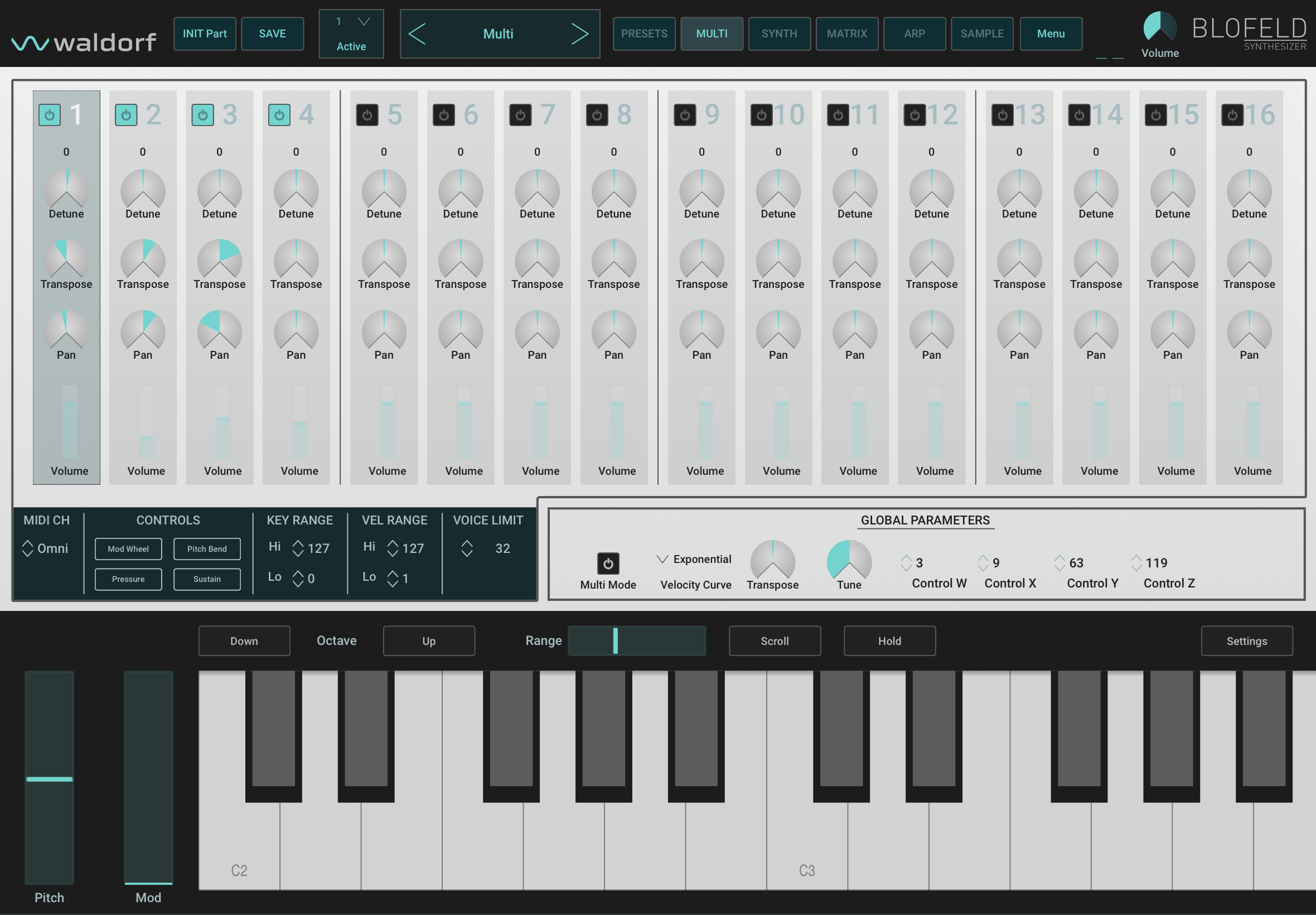 Die iPad-Version des Plugins ist mit einem flexiblen 16-fach-Multimode ausgestattet. Du kannst jedem Part einen eigenen MIDI-Kanal, eine eigene Anschlagdynamik und eine eigene Tastaturzone zuweisen – so baust du ganz einfach komplexe, mehrschichtige Sounds.