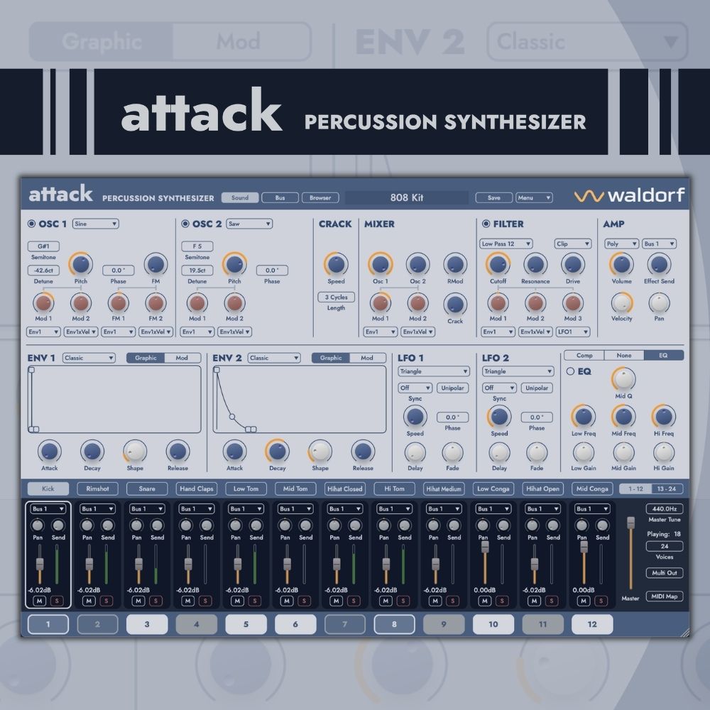 Der Attack 3 definiert Waldorfs legendären Percussion-Synthesizer für moderne Produktionen neu. Die Kombination aus kraftvoller virtuell-analoger Synthese und optionalen Samples liefert den ikonischen Club-Sound der 80er und 90er Jahre. Getreu der Philosophie „Synthesis First“ liegt der Fokus weiterhin auf der reinen Klangerzeugung, um einzigartige Sounds von Grund auf zu erschaffen. Alle Parameter sind vollständig in der DAW automatisierbar und laden zum intuitiven Sounddesign in Echtzeit ein.