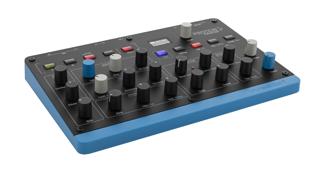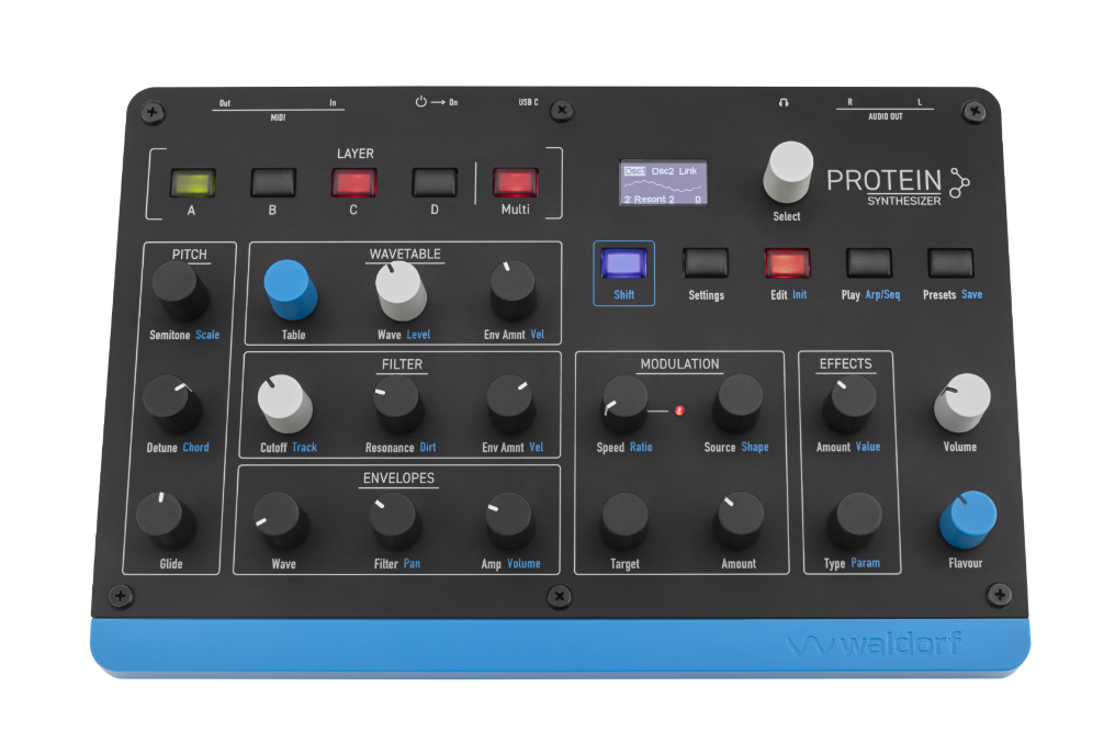 Protein ist ein preisgünstiger und kompakter, achtstimmig polyphoner Wavetable-Synthesizer, der auf den originalen Microwave 1 ASIC Oszillatoren basiert und sie mit modernen Features aus der Iridium-Reihe kombiniert – darunter ein ausgefeilter Arpeggiator, Step Sequencer, Chord Mode, Effekte und mehr. In Protein schlägt das Herz der ersten Synthesizer von Waldorf, interpretiert die ursprünglichen Ideen jedoch auf eine zeitgemäße und überraschende Weise.